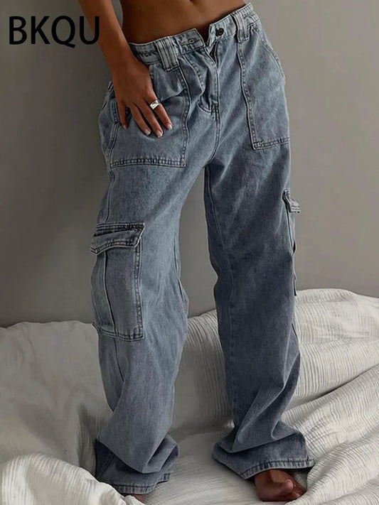 BKQU Harajuku Low Waist Jeans Women 2023 Streetwear Y2K Retro Wide Leg Straight All-match Loose Fashion Denim Trousers Vintage